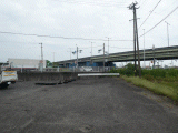 迂回路は此処で左に折れます。写真右側に見える高架道路は県道です。