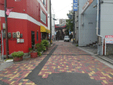 正面奥には、表参道スワマエと書かれた飾り門(〜アーケード街)が覗えます。旧道右側の緑は、諏訪神社です。