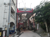 写真には諏訪神社の石灯籠(写真右側)と、その左に縣社諏訪神社社碑も写っています。アーケードの看板には、七福神の一人(恵比寿天?、大黒天?)も描かれています。