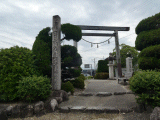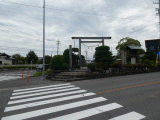 参道右手には手前から順に、日永の追分立札、道標、笠付灯籠、水場が在ります。参道の先は鳥居で、鳥居には注連縄が飾られており、その右側には神宮遥拝御鳥居石柱、鳥居を潜ると永代常夜燈一対、その先は石段三段、階段二段の下りです。