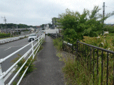 此処の交差点は直進します。この先右側歩道の右手に、下に降りる階段が在ります。