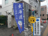 左手に同石碑が建っています。石碑の手前には青い幟も建っており、東海道、ここは四日市の文字と、小僧が描かれています。