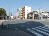 交差点右奥には例の青色東海道→道標が有ります。ガイドは右折をして、横断歩道を渡ります。