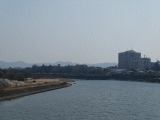 写真は豊橋から豊川の川上方向(東方向)を撮っています。見えづらいですが、左側堤防の上方に鉄櫓が写っています。橋の右側に在る背の高い建物は、市役所です。