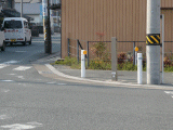交差点の右奥にSUS製の道標が建っています。正面車道側は無地で、裏面に←300m名鉄国府駅、→200m芭蕉句碑(国府観音)、右側面に←東海道歴史のみち、豊川市教育員会、
