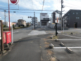 交差点の右奥に見よう歩こう富士市の東海道ポストが有ります。右側面には間宿本市場、↑吉原宿、左側面には間宿本市場、↑柚ノ木とあります。