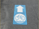 31)自転車が描かれた青色のペイント道標:交差点手前、徒歩158分、道路北側